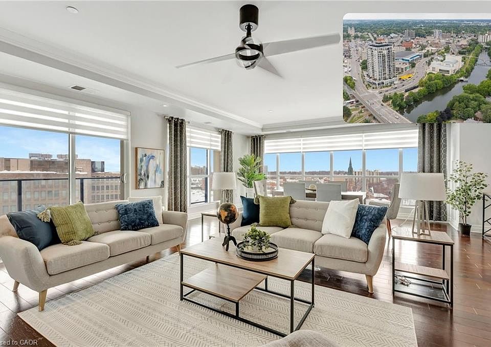 Welcome to River House, Guelph’s premier upscale condominium complex! This bright and spacious corner unit has been freshly painted and is truly move-in ready. The open-concept living and dining area is both stylish and inviting, featuring two walls of expansive windows that flood the space with natural light and provide sliding door access to the balcony. The kitchen was tastefully updated in 2022, complemented by new light fixtures and pot lights for a modern touch. This unit offers two bedrooms and two bathrooms, with laundry conveniently located just down the hall. You'll love the 9-foot ceilings, engineered hardwood flooring, and the cozy electric fireplace, enhanced by a custom-built wall unit. Thanks to its southwest and northwest exposure, you'll never miss a breathtaking sunset! Adding to the convenience, this unit includes two side-by-side EV-ready parking spaces (#17 & #18 on LL2) and a private storage locker (#15) just outside the hallway. The location is unbeatable within walking distance to the GO Train and rail access, scenic walking trails along the Speed River, and all that downtown Guelph has to offer, from local restaurants and shopping to theatre and entertainment. Residents of River House enjoy a range of exceptional amenities, including a state-of-the-art gym with river views, media and party rooms, a guest suite, a library, and more-all conveniently located on the 4th floor. There's also a secure bicycle storage room on P3, with easy access from both the elevator and the Macdonell parking garage. This is a rare opportunity to own a unit in a beautifully maintained and secure building-simply move in and start enjoying everything River House has to offer!
