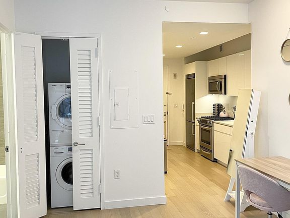 Alcove studioStainless steel blomberg refrigeratorBosch washers and dryersThoughtful touchesDouble hanging rodDaltile porcelain tileWhite oak finished floors