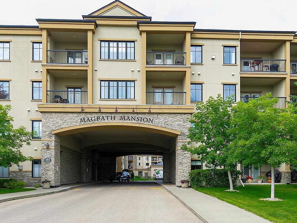 A rare find in MAGRATH MANSION! This beautiful EXECUTIVE (18+) condo features 2 bedrooms, 2 bath + DEN. Plenty of natural light throughout with an open concept floor plan and 9 foot ceilings offer an airy feeling throughout. The spacious kitchen boasts attractive cherry wood cabinetry with granite countertops and stainless steel appliances. The dining area will accommodate a large table + China cabinet for entertaining. There is an in-suite laundry/storage room. Primary bdrm features a 4 pce ensuite with jetted tub PLUS a huge walk-in closet. Private west facing balcony access from LR and bedroom. Amenities include gym, sauna, hot tub, theatre, outdoor entertainment area with fireplace & social room. Steel & concrete building with fan coil heating and cooling system. Heated underground titled parking with storage locker & convenience of a car wash. SECURE building, all professionally managed. Walking distance to ample Shopping, restaurants, Magrath Creek Park and Ravine with lots of walking trails!