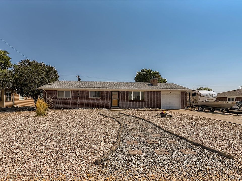 What a wonderful all brick ranch style home! Starting with the exterior, the front yard is a xeriscaped landscape design with a nice pathway leading to the front door. When you walk inside this lovely home you will notice its gorgeous laminate floors and open concept throughout the main floor. It has a large kitchen with lots of cabinet space and well crafted open bar top, perfect for entertaining! The dining area sits perfectly just adjacent and flows into the living room where you are greeted with a beautiful fireplace and rustic stonework surrounding. Down the hall there are 3 very nice sized bedrooms and 2 guest bathrooms. The views from the 2 bedrooms on the west side have open unobstructed views across an open field. Check out the pantry before heading downstairs into the finished basement, where it lands at a large flex space/living room area with 2 attached bedrooms, 1 more bathroom, laundry/mechanical room, and a shelved storage room. Both bedrooms downstairs feature his and her closets and the bathroom has a nice tiled stand up shower. The backyard is awesome and is a wonderful space for playing, entertaining, gardening, grilling, and much more as there is plenty of room to make it yours. It also has ally access and space for parking your toys/RV/boat/ect. NO HOA!!! Low taxes! Lots of yard space. Easy access to the highway, unobstructed views out front, tons of natural light, attached garage, and a great floor plan!