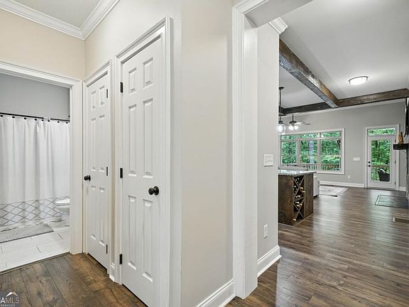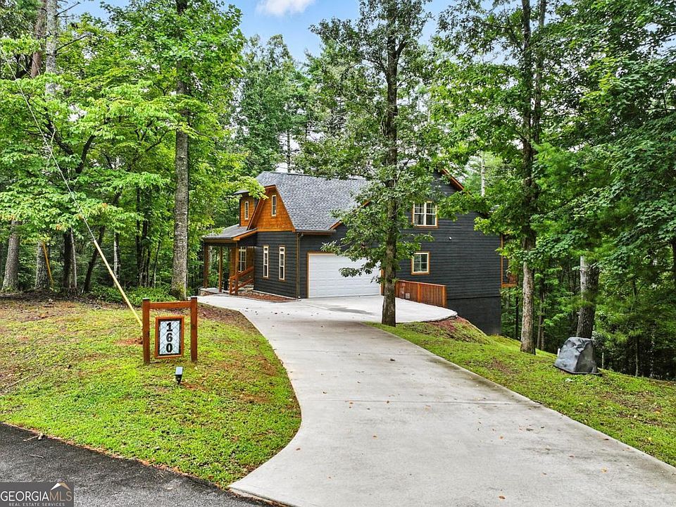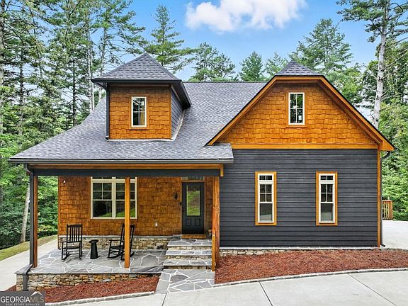 This stunning 4-bedroom, 4-bath home offers the perfect blend of rustic elegance and modern comfort in the highly desirable Buckhorn Estates community. With a main-level 2-car garage plus a lower-level 1-car garage, convenience and storage are abundant. The inviting Craftsman exterior has shaker shingle and stone accents, welcoming you inside to a warm and thoughtfully designed interior. A guest bedroom and full bath are located just off the entry, while the heart of the home is a cook's dream kitchen with lovely beamed ceiling, a huge island complete with seating and built-in wine rack, rich wood cabinetry, granite countertops, and a pantry. The kitchen flows seamlessly into the spacious great room, where a cozy gas fireplace and a wall of transom-topped windows frame the natural scenery. Step onto the expansive covered back porch with its own gas fireplace, the perfect spot to relax, entertain, and watch deer wander through the peaceful wooded surroundings. The main-level owner's suite is a private retreat with French doors to the porch, a crown-molding clad tray ceiling, and a luxurious ensuite with a double vanity, soaking tub beneath a picture window, glass-enclosed shower, and walk-in closet. Upstairs, you'll find two additional bedrooms with generous closets and a full bath. The lower level offers endless possibilities, with a finished full bath and two large unfinished spaces with tall ceilings, ideal for creating a second living area, in-law suite, hobby space, home gym, or whatever your needs may be. Nestled in the heart of the North Georgia mountains an easy drive to both Ellijay and Blue Ridge, Buckhorn Estates features a community lake, peaceful riverside park, and public golf course, all connected by scenic, paved roads with no short-term rentals allowed. This rustic yet refined property would make the perfect full-time home or mountain getaway. Come home to the mountains where comfort, nature, and community meet.