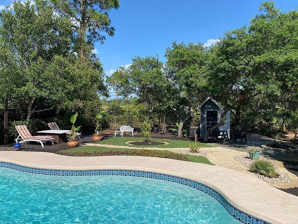 Looking for your own piece of paradise? This 3/2 custom home is waiting for you to enjoy! Located only 3 miles from beautiful Lake Jackson and the down town area. Situated at the end of a quiet rural street surrounded on one side and the back by 150 acres of pasture. A wooded lot on the other side has this home tucked away! This is old Florida right in your own back yard! The back faces east and is the perfect place to enjoy your morning coffee as you watch the sun rise with a burst of orange coming into view! A uniquely designed decking and salt water pool in a very private (for those summer night dips!) setting that complements a resort styled, fenced back yard complete with a bistro deck, large open blue flagstone patio with fireplace, under a canopy of numerous mature scrub oaks. A beautiful pergola and separate sun deck adjacent to the pool is ideal for poolside relaxing. The landscaping is delightful, low maintenance with numerous water bibs/electrical outlets and triangular bridge! You'll also enjoy the little pathways throughout. There is also a cute little Craftsman styled chicken house if you would want to have your own fresh eggs every day! It has an attached run through a curving ravine along the back of the property. If not, it would make a great garden house! There is a garden bed incorporated in the ravine with underground drain. Inside the home you'll find high 10’ ceilings with crown molding in the living area, tile flooring with exception of carpeted bedrooms. The kitchen is super functional with stainless steel appliances, Corian countertops, white cabinets and a pantry! The master bedroom is spacious with a walk in closet and the master bath, also spacious, has a large offset corner soaker tub and separate shower. Two more bedrooms on the other side of the home with a guest bath in between boast large windows. Custom window treatments throughout includes beautiful shutters in the living area and front bedroom. Tall French doors lead from the dining area and two bedrooms opening to a 10 x 20’ screened Lanai out to the pool and yard. Over sized two car garage has foldable work bench, extra outlets and side door. Exterior newly painted!