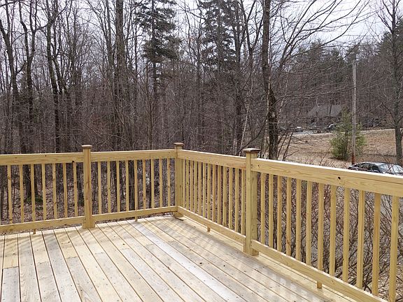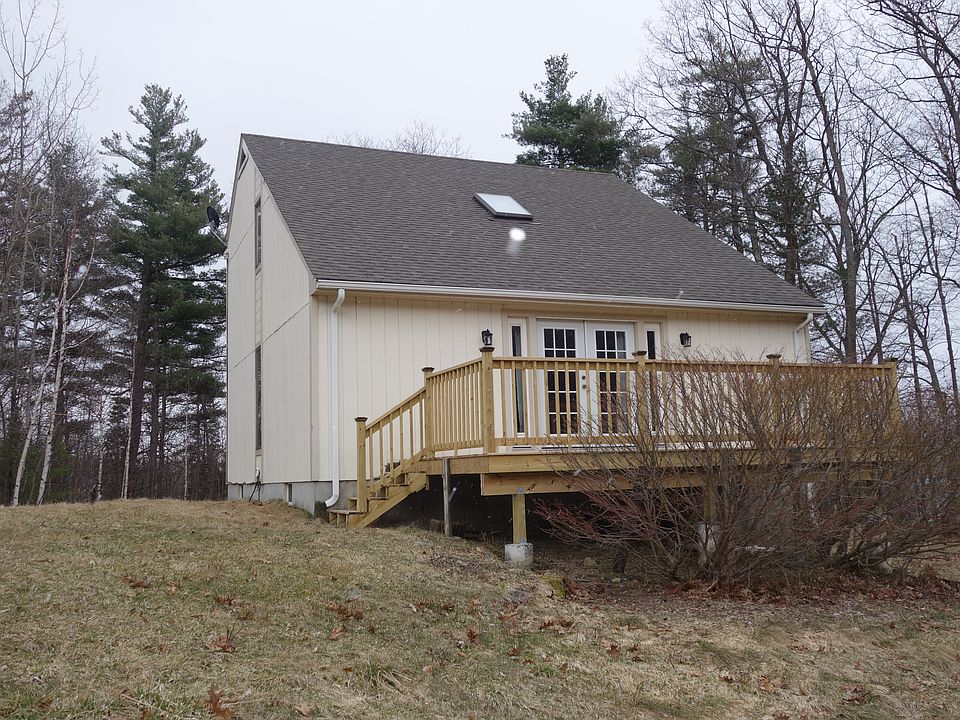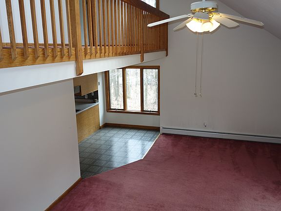 Contemporary home situated on private 2.7 ac secluded setting. Cathedral ceilings 1st flr M bd + bath, spacious LR w/ balcony. Finished lower level - Nice level backyard w/ pond - Also shared beach, clubhouse + pool - Very affordable, energy efficient, year round + low taxes!
