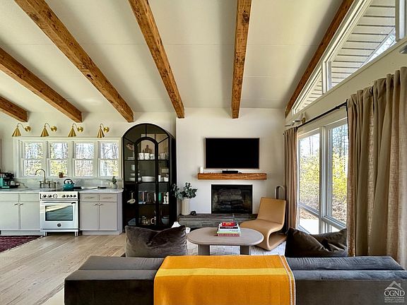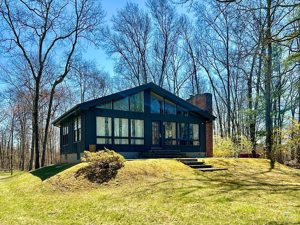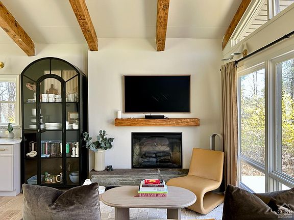 Set back on a quiet country road this striking custom contemporary home is a true escape from the everyday. The open concept living area welcomes you with an abundance of natural light from the floor to ceiling windows, creating a light and airy atmosphere throughout. The chef's kitchen features custom cabinetry, designer lighting, and plenty of space for entertaining or quiet nights in. The primary bedroom is bathed in natural light, offering a serene space to rest and recharge. The second bedroom features a quiet, cozy sleeping loft. The spa-like bathroom includes a custom vanity, a wet room with an open shower and a deep soaking tub overlooking the private, bucolic backyard. Unwind and enjoy the outdoors on the back deck. A firepit area is perfect for evening gatherings, making this space ideal for both entertaining and peaceful solitude. This home blends privacy with modern amenities in a location that provides the best of both worlds, under 2 hours to NYC, close to New Paltz restaurants and shopping, Mohonk Mountain House, hiking, biking, rock climbing, waterfalls, swimming holes, and more in Minnewaska State Park. This unique turn-key property offers a peaceful oasis as a weekend retreat, vacation getaway, or full-time residence.