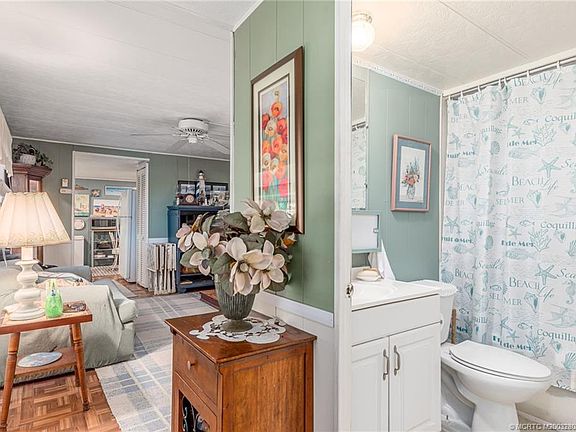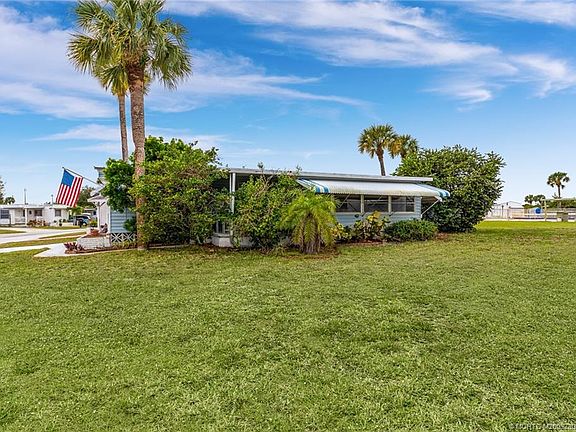 Tastefully updated, this colorful Key West inspired home offers a spilt floorpan for privacy, open kitchen with walk in pantry, double sink vanity in the main bath and climate controlled Florida room for additional living space and private front porch. There is also a large outdoor shed that houses a personal washer and dryer so there is no need to use the community laundry. Prime location in the community that backs up to swimming pool and has no direct neighbors to the right of the property. Just bring your bathing suit as this cozy place comes fully furnished right down to an unopened package of new toothbrushes! Roof (2005)and plumbing updated to PVC. Leisure Village is vibrant community located in the heart of Stuart complete with swimming pool, bocce and shuffleboard courts, underground utilities.