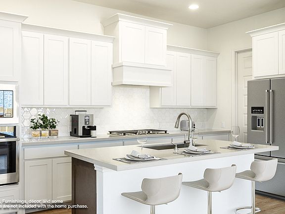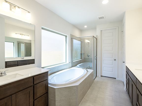 Coffered extended entry leads past game room to open kitchen, dining area and family room. Kitchen features deep walk-in pantry, 5-burner gas cooktop and generous island with built-in seating space. Dining area features curved wall of windows. Family room features wall of windows. Primary suite includes bedroom with wall of windows. Double doors lead to primary bath with dual vanity, garden tub, separate glass-enclosed shower and oversized walk-in closet. Abundant closet space and large windows add to this spacious four-bedroom design. Extended covered backyard patio. Mud room off two-car garage. Representative Images. Features and specifications may vary by community.