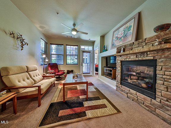 The primary suite is a true retreat with ensuite bath and direct deck access. The second bedroom is generously sized and features his-and-hers closets from a private hallway that leads into a shared full bathroom, offering convenient access to both the bedroom and the main living area. In-unit laundry, an oversized one-car garage, and an additional storage closet just outside your front door provide all the practical comforts that make mountain living seamless.