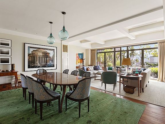 Thoughtful details abound throughout: coffered ceilings, bespoke millwork, and built-in art display cases. The discreet in-wall Sonos sound system enriches the living room, dining room, library, and kitchen. There is also multi-zone central air and heat as well as a home-sized laundry room.