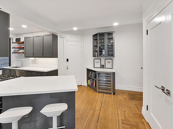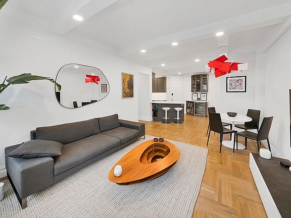 The living and dining area has a classic pre- war sense while being beautifully designed. You are greeted with a warm, open feel with hardwood floors, recessed lighting, and a modern renovation. Oversized windows bring in all-day sunlight and beautiful green views.
