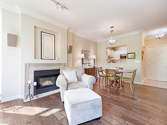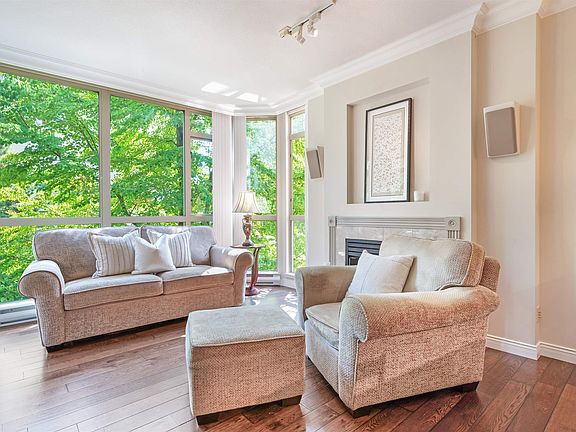 Welcome to Victoria Park West, a sought-after concrete building in the heart of Central Lonsdale. This 2-bed, 2-bath home features a custom kitchen with high-end cabinetry, designer counters, elegant backsplash, and stainless steel appliances. Bright east-facing living spaces boast oak hardwood floors, 9-ft ceilings, updated lighting, custom blinds, and a cozy gas fireplace. The spacious bedrooms include a serene primary with ensuite, while the private balcony offers a peaceful treed outlook. Enjoy the convenience of in-suite laundry, ample storage, parking, storage. Two guests suites. With its strong reputation and superb walkable location, Victoria Park West places you steps from shops, cafes, restaurants, and all the best of Central and Lower Lonsdale. OPEN HOUSE SUNDAY CANCELLED