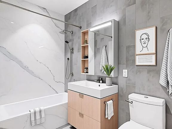 -Bathroom features Italian porcelain tile, a custom vanity, and a built-in illuminated mirror.