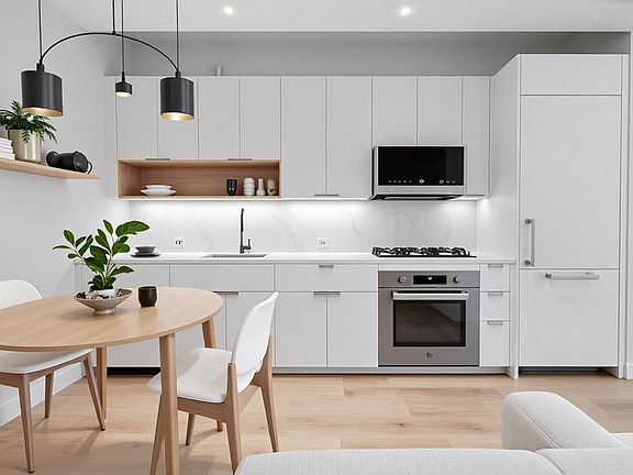 -Custom cabinetry and floating shelving provide elevated kitchen storage and aesthetics.