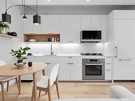 -Custom cabinetry and floating shelving provide elevated kitchen storage and aesthetics.