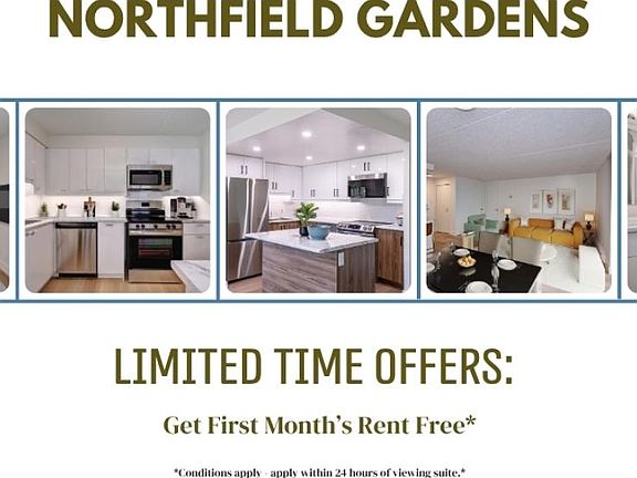 About**Get First Month's Rent Free! Conditions Apply**Apply within 24 hours of viewing the apartment.Welcome to Northfield Gardens. These clean, modern 1 & 2 bedroom apartments are in 6 buildings nestled in a park-like setting in North Waterloo. Most of the apartments are upgraded to include Luxury Plank Flooring in common and bedroom(s), custom ceramic tiles in the kitchen and bath(s). Apartments include 3 appliances (fridge, stove, and built-in air conditioner) and are + electricity and + water.Community AmenitiesElevatorsSecurity onsiteCertified Rental BuildingOn-Site Professional ManagementSuite AmenitiesBalconies