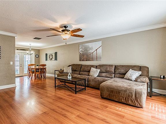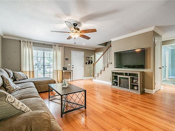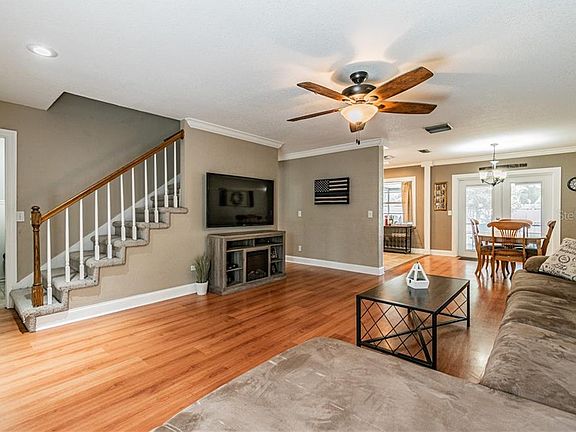 Here is your opportunity to live in a beautiful 3/2.5/2 car garage over 1600 sq feet home in Popular Carpenters Run! Wow!! As you enter you will notice the crown molding and laminate flooring in the Great room. The kitchen is gorgeous! It has been beautifully updated with upgraded cabinetry that offers soft close doors and pull out drawers and lazy susan for extra storage! Cabinets are topped with butcher block countertops and stainless steel appliance package including a double oven complete this stylish kitchen! The kitchen is open to the dining room and overlooks the screened in patio and fully fenced in back yard! In the dining room; french doors lead you to the large screened in patio and large fenced in back yard! Downstairs you will find an updated half powder bath; perfect for guests! Master bedroom is complete with crown molding nice size walk in closet and ensuite bathroom with updated shower and separate jacuzzi tub! Upstairs you will find two oversized bedrooms complete with walk in closets and remodeled bathroom with quartz vanity. Upstairs you also will find two large closets plus an amazing walk in attic! Tons of storage! Wow!! no need for a ladder to store your holiday decor when you can walk into your attic! This home has so much to offer! HVAC is 4 years old and Roof is 2011. Inside laundry room! Fenced in yard! Live in a community with low HOA and no CDD! NOT in a flood zone! Community pool, Tennis, Clubhouse, Basketball court, playground and a Daycare in the community. Near the new outlet mall and tons of new restaurants and shopping. Easy commute to Tampa and the I75! Hurry fast this home will not last! This home is a must see!!