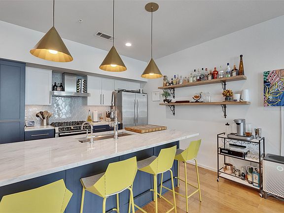 High-end upgrades and thoughtful design make this 4th-floor 2-bedroom, 2-bath condo at Barton Place truly one of a kind. This unit includes two EV-ready reserved parking spots on the main level, conveniently located near the elevators for easy access. Inside, you'll find luxurious touches like Carrera marble counters, brushed gold pendant lighting, and a 52-bottle under-counter wine fridge. Floor-to-ceiling windows fill the living room with natural light, where a custom 18-foot built-in adds significant storage, a sleek marble-topped desk, smart-lit bookcase, and standout entry feature. Crisp LED recessed lighting has been installed throughout. The second bedroom sits beside an upgraded guest bathroom featuring a steam shower, waterfall quartz vanity, and added outlets, while all windows are equipped with room-darkening shades. A tankless water heater complements the existing unit, enhancing efficiency. Across the living space, the spacious primary suite easily fits a king bed and desk, with an en-suite bath boasting a soaking tub, walk-in shower, and enhanced electrical upgrades in both the vanity and private toilet area. Overlooking the serene courtyard, this meticulously upgraded condo is a rare gem in the community. Schedule a showing today!