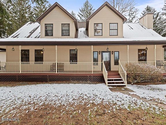 Contemporary 2 story home on 2.11 acres nestled in a private wooded setting with mountain views in the distance. This home offers two primary bedroom options: one on first floor (currently an office) with dedicated full bathroom and another on the second floor. A large loft area (with built-in bookcases) serves as another office area or library. Additional features include granite countertops, hardwood floors, a wrap around front porch, gas fireplace, French doors, new furnace 2018, generator, new skylights 2021, mini split AC and exterior entrance to basement from garage. Showings start Thursday 2/15.