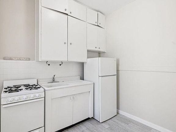 Functional kitchen with gas stove, refrigerator, and ample cabinet space