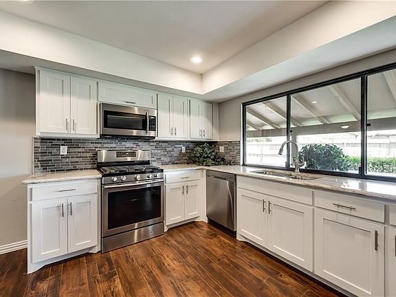Beautiful well landscaped corner lot with mature trees! Updated with fresh paint & lighting throughout. New laminate flooring in common areas & new carpet in bedrooms. Light & bright floor plan with two living areas & serving bar in dining room. Kitchen features new stainless steel appliances, recessed lighting, cabinets, tile backsplash, granite counters, sink & faucet. Living room with WBFP overlooks lush backyard. The 27 x 10 covered patio is great for entertaining with serving window to inside. Extras include: Electric panel replaced 5-18 New exterior doors. updated faucets in baths, 2 inch blinds, sprinkler system, resurfaced & sealed garage floor, 10 outlets and additional lighting in garage as well!