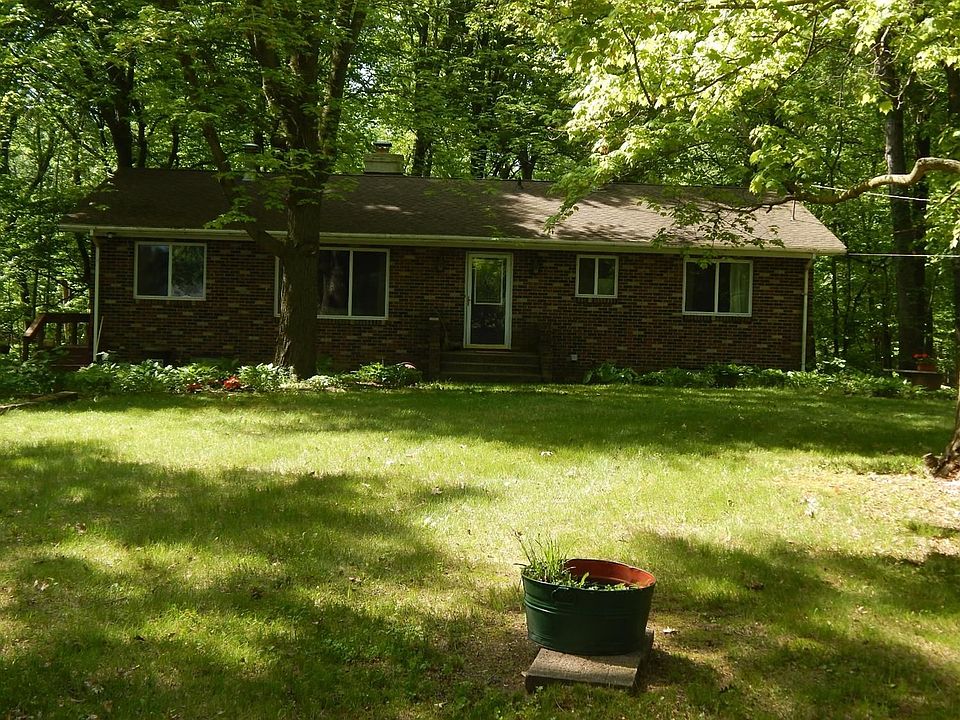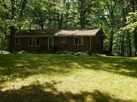 Must see this sturdy full brick ranch that sits overlooking 7.5 mostly wooded acres. Quiet and peaceful with wrap-around wide deck brings you closer for the natural beauty and wildlife that abounds. Gardens and a pond creates a magical environment. Main entry floor has 3 bedrooms, full bath, kitchen with large dining gathering area. Living room is huge and welcoming with wood burning fireplace surrounded by natural stone to the ceiling. High ceilings on main and lower level. Lower level walk-out is partially finished. Full bath and Sauna. Laundry, utility room, storage and work room plus large open space with wood burning stove. Windows and doors to the outside from walk-out create extra space and options