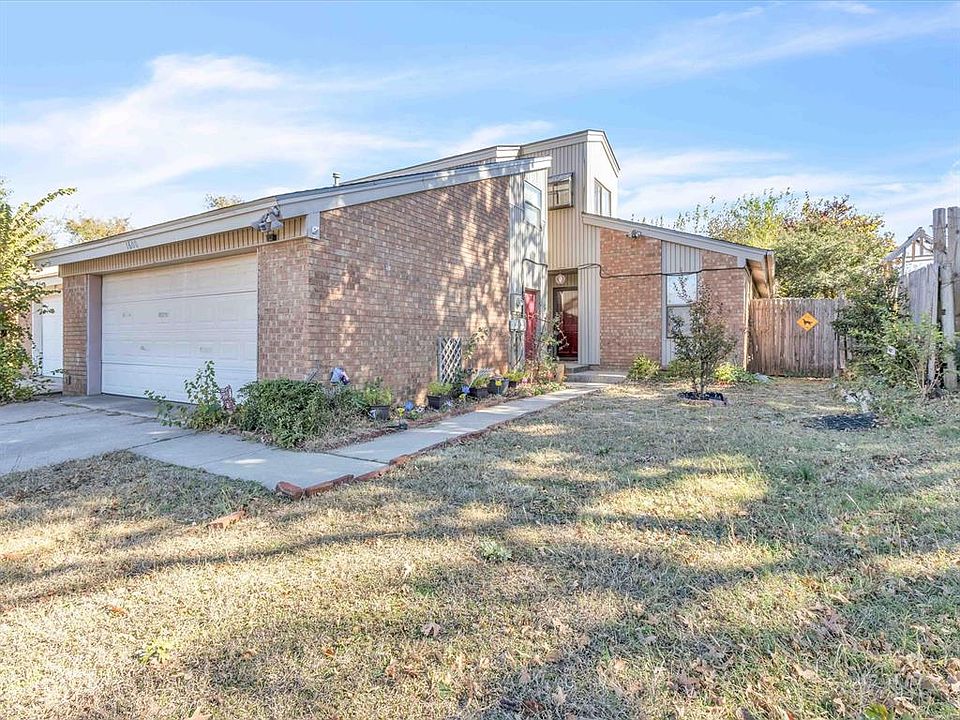 The 3-bedroom, 2-bath layout works: one bedroom and full bath upstairs for separation and flexibility, two bedrooms and a full bath downstairs for daily living. The main level's open-concept living room features soaring ceilings and a wood-burning fireplace that anchors the space. Outside, a covered patio extends your living area, while the attached 2-car garage adds convenience that matters in Oklahoma weather.