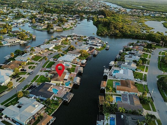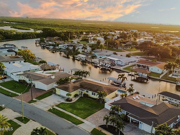 Welcome to your Florida waterfront pool home with front-row views of rocket launches, dolphins, and manatees right from your backyard! This 3 bed, 2 bath beauty in sought-after Diana Shores is bursting with upgrades and coastal charm. The open-concept layout features a fully updated kitchen with granite countertops, a spacious split floor plan, and sliders leading to a screened lanai for seamless indoor-outdoor living. Step into your private oasis with a saltwater pool (new pump & filter), a relaxing Tiki Hut, and a brand-new dock with 8,000 lb boat lift (2024). Located on one of the widest canals in the neighborhood, you'll enjoy ocean access via Port Canaveral and a perfect view of the annual boat parade. Bonus upgrades: New A/C (2025), gas tankless water heater (2022), irrigation well pump (2024), and roof (2012). Move-in ready and low-maintenance, this home offers the ultimate Florida lifestyle!