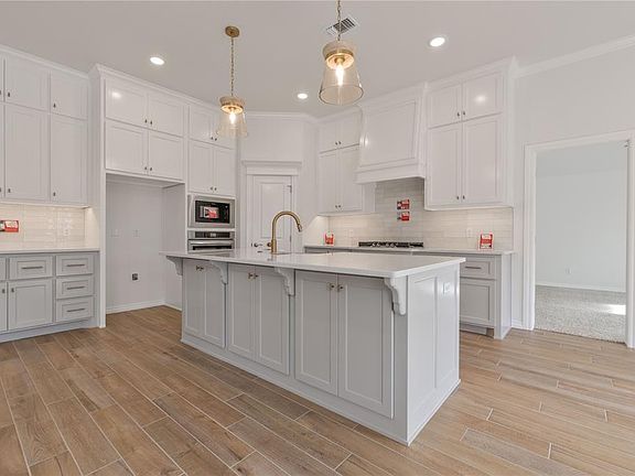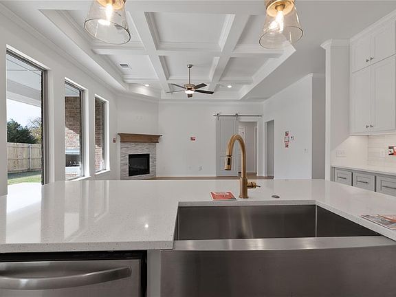 FENCING AND BLINDS INCLUDED! The Hazel floorplan has a total of 2,095 Sqft for living space, including 1,900 Sqft of indoor living & 220 Sqft of outdoor living that features a wood-burning fireplace, a gas line, & a TV hookup! This home offers 4 sizeable bedrooms, 2 full bathrooms, a utility room, covered patios, & a 3 car garage with a storm shelter installed! The great room presents a beautiful coffered ceiling with a ceiling fan, a gorgeous corner gas fireplace with our stacked stone detail, three 7' windows, crown molding, wood-look tile, & a barndoor. The kitchen has stainless-steel appliances, a 5-burner cooktop, decorative tile backsplash, a large corner pantry, custom-built cabinets to the ceiling with cabinet hardware installed throughout, 3 CM countertops, more wood look tile, stunning pendant lighting, & an oversized center island that holds a farm sink & a dishwasher. The primary suite spotlights a sloped ceiling detail with a ceiling fan, windows, & our cozy carpet finish. The prime bath has a Jetta Whirlpool tub, a dual sink vanity, a walk-in shower, & a huge walk-in closet. Other amenities for this energy efficient home include a tankless water heater, a whole home air filtration system, R-44 and R-15 insulation, & so much MORE!