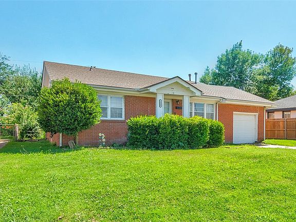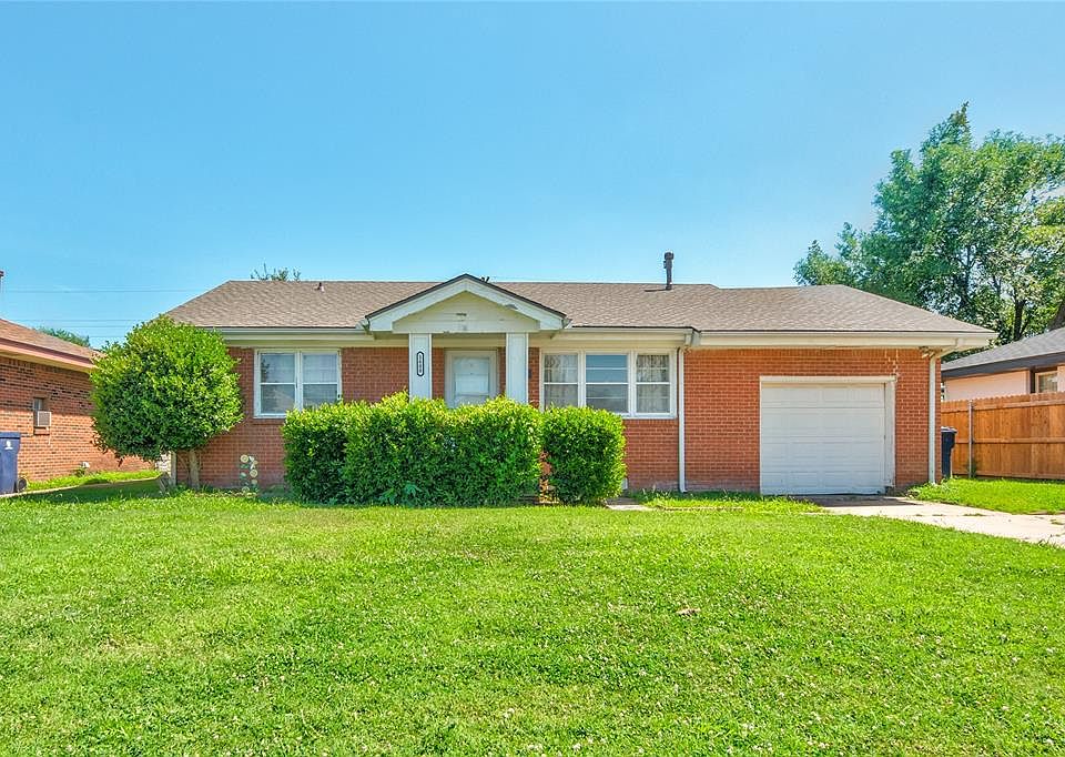 Charming all brick ranch with great bones, brand-new roof installed July 2025, and a $3,000 seller credit for the flooring of your choice. Step onto the covered front porch and into a bright living room highlighted by a picture window that fills the space with natural light. The sunny eat-in kitchen offers abundant cabinetry, gas range, tiled counters and backsplash, plus a cheerful dining nook. Two flexible bedrooms include a generous primary and a secondary room perfect for guests, office, or nursery. The full bath is clean and functional with a tiled tub-shower combo and plenty of storage. Central heat and air, laundry hookups in the garage, and an attached one-car garage add everyday convenience. Out back, enjoy a fully fenced quarter-acre lot with mature trees ideal for pets, gardening, or future additions. A little cosmetic TLC and your new flooring will create instant equity. Minutes to I-44, shopping and dining on SW 59th, Will Rogers Airport, Boeing and FAA campuses, and only fifteen minutes to downtown OKC. Move-in ready today, equity builder tomorrow—schedule your private showing today!