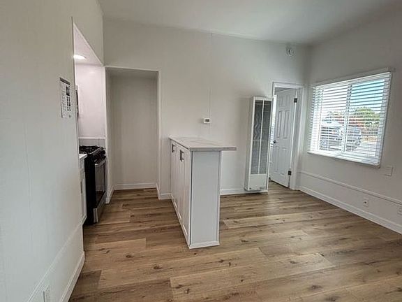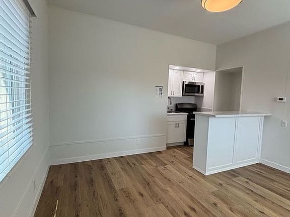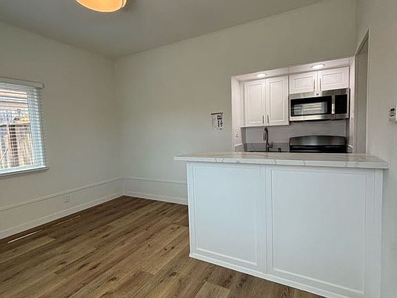 Large and freshly painted with faux wood horizontal blinds, a ceiling fan, and two bright windows that fill the room with natural light. The kitchen features a brand-new stainless steel 30" gas stove and micro-hood.