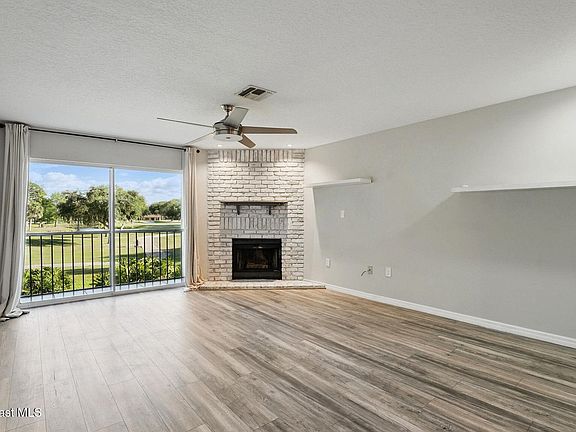 Stylish Golf Course Condo in The Oaks of Country Club - Welcome to this beautifully updated 2-bed, 2-bath condo located in the desirable community in Rockledge. Overlooking the scenic Rockledge Country Club golf course, this charming condo combines comfort, character, and modern style. The kitchen offers white shaker cabinets, farmhouse-style open shelving, granite countertops, tile backsplash, and stainless steel appliances. The open-concept living area features stylish plank flooring, a cozy fireplace, and large sliding doors that lead to your private screened patio with peaceful golf course views. The spacious master suite includes a walk-in closet and an updated en-suite bathroom. The guest bedroom and bath are equally inviting, making this home ideal for full-time living or a seasonal retreat. Tile flooring throughout kitchen and dining area. Community Pool and close to Viera and Cocoa! Enjoy low-maintenance living in a tranquil golf course setting—schedule your showing today!