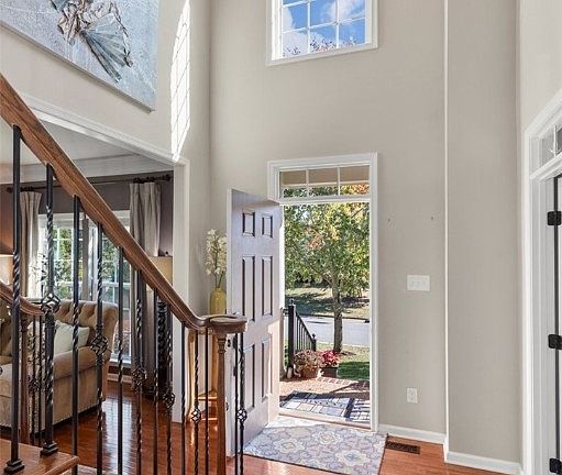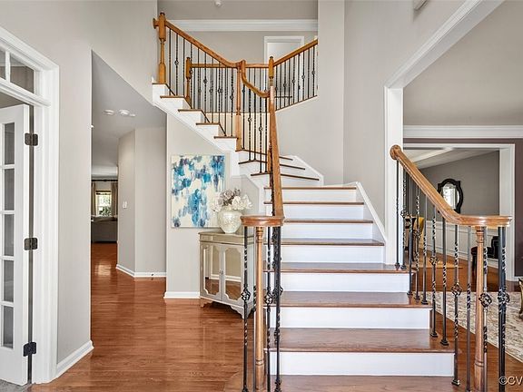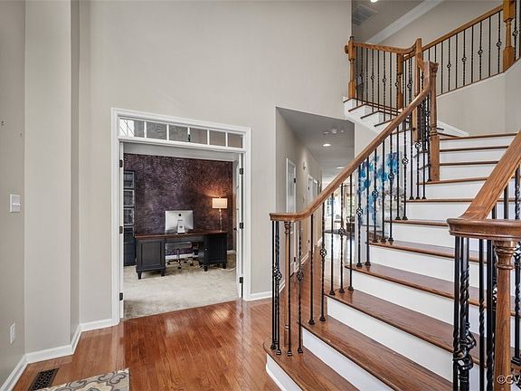 Welcome to 16000 Walkers Chase in the sought-after Foxcreek subdivision. This beautifully maintained two-story home is located on a quiet cul-de-sac lot. As you enter, the stunning staircase and immaculately resurfaced hardwood floors flow seamlessly throughout the first level setting a tone of elegance and sophistication. The spacious living room adorned with a lovely bay window leads to an additional family room boasting a cozy rock fireplace and opening to the gourmet kitchen. A bar height center island, ample eat in space, plenty of storage, granite countertops, and stainless appliances complete this chef's dream. A formal dining area, well appointed office space, a lovely half bath, and a picture perfect laundry/mudroom round out the first floor. Upstairs the primary bedroom is stylishly comfortable with a tray ceiling, ensuite bathroom, walk-in closet with built ins, and a separate sitting area. The second floor includes a second bedroom with an ensuite bath and a nice size closet. The remaining 3 bedrooms are well lit with spacious closets, and another full bath is found on the second floor. Downstairs the fully finished walk in basement boasts a versatile layout, wet bar, spacious rec area, exercise room, and media room providing the perfect backdrop for movie nights and game days. Professionally installed lifetime warranty blinds have been installed on most windows, and one of the 2 zoned HVAC units was replaced in 2022. The fenced backyard is a serene private oasis, landscaped beautifully and featuring a deck, patio, and fire pit. The Foxcreek community is conveniently located to the Hull Street corridor with lots of shopping and dining options as well as easy access to 288 and Powhite Parkway; the subdivision also boasts an olympic outdoor pool, year round indoor pool and fitness center, clubhouse, splash pad, parks, playgrounds, multi-use fields and trails. Don't miss the chance to make this lovely home that truly has it all yours!
