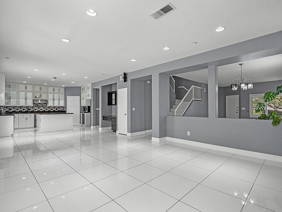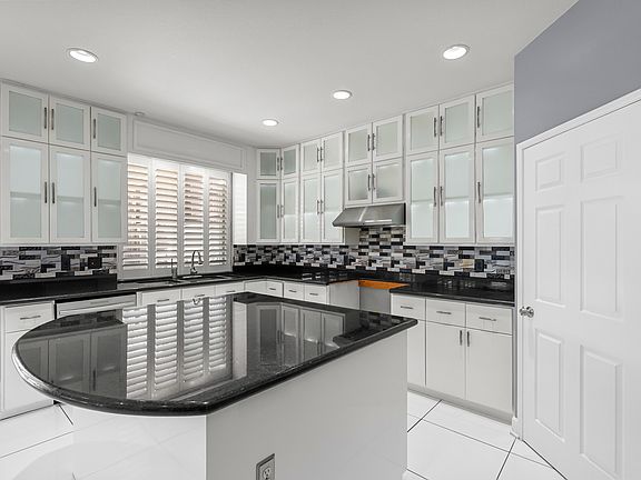 Private backyardOpen-concept kitchenLarge islandFresh interior paintPrimary suiteWhite tile flooringGlass-front cabinetry