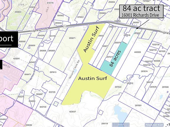 This approximately 84-acre tract sits directly north of the highly anticipated Austin Surf Club Venture, a premier lifestyle development slated to feature a world-class surf park, craft brewery, luxury residences, and resort-style amenities. Backed by an impressive group of investors — including Tony Hawk, Kelly Slater, Matthew McConaughey, and Drew Brees — the Austin Surf Club is set to become one of Central Texas’ most iconic destinations. Positioned immediately adjacent to this landmark project, the property offers exceptional potential for mixed-use development, such as luxury housing, boutique retail, commercial facilities, or a golf course. Importantly, the Austin Surf Club’s master plan does not include a golf component, creating a unique opportunity for a complementary, high-end amenity just next door. Two contiguous 40 acre tracts make up this 80 acre parcel at the back of the entire 138+ acre parcel. An estimated 3 +/- acre tract running the length of the eastern fence line from Richards Drive to the top 40 acre tract, 35' wide is included in the sale for road access. No road currently exists to the two tracts. An estimated 19 acres lies within the floodplain. Property lies within the 2 mile ETJ of the City of Austin, and property is located within an Opportunity Zone. The two tracts are fairly flat, cleared and mostly fenced. Seasonal tributary at the bottom of the parcel. Currently Ag exempt. Many potential building sites and uses. 6.6 miles to COTA raceway and 6.6 miles to the Austin Bergstrom Airport. Shown by appointment only. Information herein is deemed reliable, but not verified or guaranteed. Users are responsible for checking the accuracy, completeness, currency, and status of all information. All measurements and all calculations of area (i.e., Sq Ft and Acreage) are approximate.