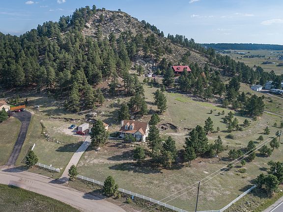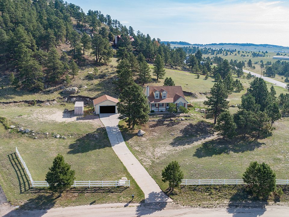 Excellent corner-lot location! Home sits on 5 acres, zoned for horses, lot is beautifully treed, fenced in the front, large concrete patio and lovely bluffs in the back. 5 bedrooms, 3 1/2 baths, and 2 car detached garage. Kitchen completely renovated: soft-close cabinets, granite countertops, and updated appliances (gas stove, refrigerator, dishwasher, microwave). Kitchen has walk-out to back plus large dining room space adjacent. Main level flooring is ceramic tile throughout living room, dining room, kitchen, half bathroom and laundry. Flooring on staircase and upstairs level is updated vinyl planking. Main level master bedroom and master bathroom, with a zero-threshold into oversized shower! 2 bedrooms and 3/4 bathroom located up. Basement has 2 additional bedrooms, 3/4 bathroom, and tiled flex space with walk-out to fenced-in area. Additional updates include: Roof replaced (2010), radon system, swamp cooler, fireplace, upgraded electrical panel, reverse osmosis kitchen faucet.