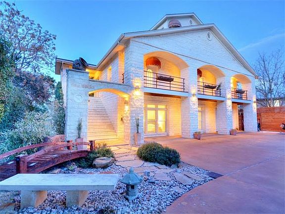 Located in a private setting this gated Lake Travis waterfront home features lake views and a modern design. Spacious 3 story floor plan. Lavish outdoor living space highlights exceptional landscaping, outdoor grill, boat dock and water fountain. Interior offers elevator, surround sound speakers, high end appliances and travertine floors. Incredible "spa like" master bathroom suite. Additional entertaining pavilion with playscape down by water. Gentle slope to lake. Boat dock included, deep water cove.