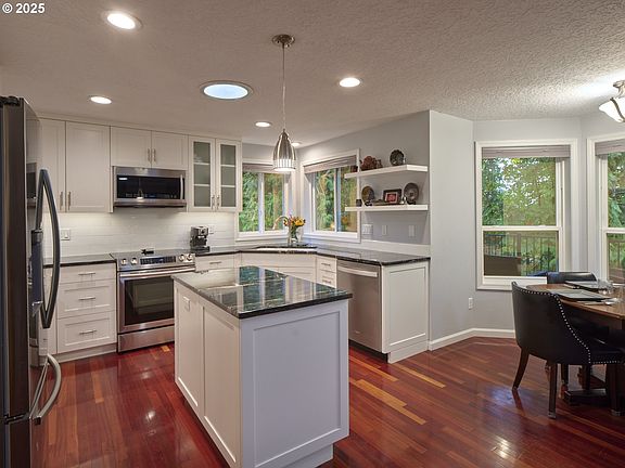Beautifully Remodeled Home in the Coveted Cimarron Neighborhood!This thoughtfully updated 5-bedroom, 3-bathroom home offers flexible living options ideal for multi-generational households or potential rental/ADU use. The main level features an inviting open-concept living, dining, and entry area with vaulted ceilings, cherry wood floors, and a cozy gas fireplace. The newly remodeled kitchen boasts a granite island, all-new cabinets, granite countertops, stainless steel appliances, and solar tubes for natural light. Three spacious bedrooms, including the primary suite, are conveniently located on the main level. The primary bathroom has been beautifully remodeled with granite counters, an oval soaking tub, and a pebble-floor glass shower. The secondary full bath on the main level also features new granite counters and updated finishes. Step out from the main floor family area onto the newly reconstructed Trex-style deck, perfect for entertaining or relaxing while overlooking the tranquil green space.The fully finished lower level offers two additional large bedrooms, a full bathroom, a cozy family room with a gas fireplace, a kitchenette area, and a second laundry—plus its own exterior entrance and a locking privacy door for separation between floors and versatility. High ceilings create an open, airy feel throughout the lower level. An unfinished area provides ample storage or the opportunity to expand the finished square footage for additional value. Outside, enjoy mature and carefully tended landscaping, a fenced backyard, fiber cement siding, a newer high-end roof, and central vacuum system. This move-in-ready home perfectly balances comfort, privacy, and functionality in one of the area’s most desirable neighborhoods.
