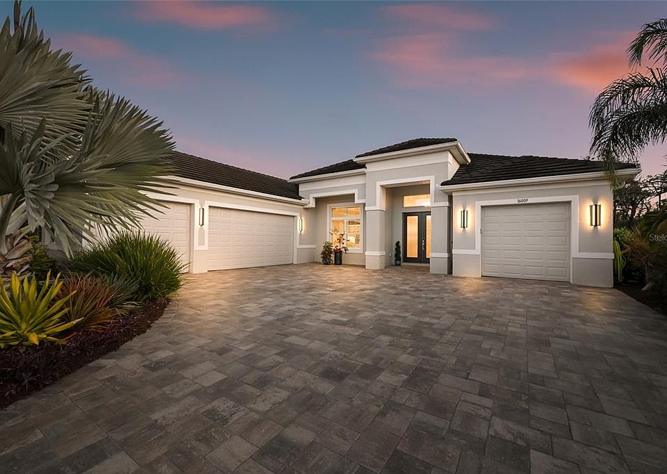 Welcome to this exquisitely customized and designed Santa Maria Model, perfectly situated within the secure, gated boutique community of The Reserve at Twin Rivers. This luxurious four-bedroom, three-bathroom home with two primary suites and an oversized four-car garage exudes sophistication from the moment you arrive, featuring striking curb appeal enhanced by mature landscaping, a long pavered driveway, and a modern custom elevation. Step inside to discover a warm, inviting atmosphere elevated by designer finishes, including elegant crown molding, wood-look tile flooring, and no carpet throughout the home for a sleek, cohesive aesthetic. Unobstructed preserve views are visible from nearly every window, creating a constant connection to nature. The open, flowing floor plan is ideal for both relaxed living and grand entertaining, offering multiple distinct gathering spaces. The great room impresses with a custom woodwork cathedral ceiling, a statement chandelier, a floor-to-ceiling stacked stone electric fireplace, and expansive pocket sliding doors that open effortlessly to the lanai. The dedicated dining room glows with natural light beneath a custom wrought iron chandelier and flows seamlessly into the gourmet kitchen. A chef’s dream, the kitchen features a massive 13-foot quartz island with updated pendant lighting, high-end appliances including a new glass Bespoke refrigerator, induction cooktop, and double steam microwave convection oven combo, all complemented by a sleek designer touch faucet. A charming eat-in nook framed by a bay fishbowl window offers beautiful preserve views while dining. The primary retreat is a private haven, complete with tall tray ceilings, sliding glass doors, and a picture window overlooking the sparkling pool and lush preserve. The luxurious en-suite includes two custom walk-in closets, dual vanities, a soaking tub, and a tiled walk-in shower. A private guest wing hosts two spacious bedrooms with new top-of-the-line LVP flooring and a large shared bath, while the club/flex room at the rear of the home—with full pocket doors and a private bath—offers versatile living options and direct access to the lanai. The true centerpiece of this home is the resort-style outdoor oasis. Three sets of pocket sliding doors create a seamless indoor-outdoor living experience. The expansive covered area features a custom-stained wood beam ceiling with dual designer fans, a full outdoor kitchen, and a sparkling saltwater pool with a new color-changing lighted waterfall. A 40-foot panoramic clear-view screen perfectly frames breathtaking views of majestic Spanish oaks and the beautifully fenced backyard, offering total privacy and tranquility. Every detail of this home has been meticulously curated, blending luxury, comfort, and natural beauty. Conveniently located near shopping, downtown St. Pete, Lakewood Ranch Waterside, Tampa and Sarasota airports, award-winning beaches, and UTC Mall—all with no CDD fees—this property delivers an unmatched Florida lifestyle in one of the area’s most sought-after communities.