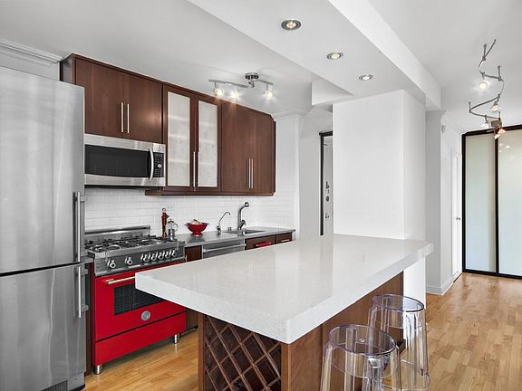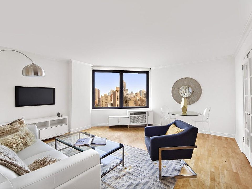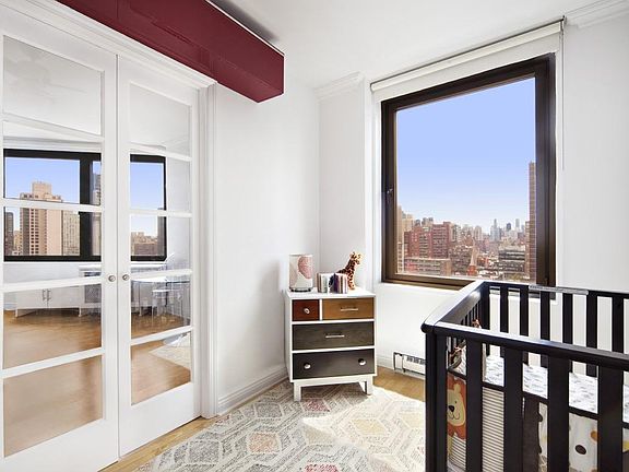 This beautifully renovated Junior 4/converted two-bedroom presents a rare opportunity to own a Carnegie Hill home in a 24-hour doorman condo building priced under $1 million. Enter this sunny high-floor beauty and take in the fantastic great room lined by panoramic views of the Upper East Side and East River from the oversized corner window. Nearby, the open chef's kitchen gleams with glossy Caesarstone counters and custom cabinets set alongside top-of-the-line stainless steel appliances, including a brand-new silent Bosch dishwasher and stunning Bertazzoni six-burner range in fire engine red. The large bedroom captures more glorious city views while providing wall-to-wall California closets and ample room for a king-size bed. The windowed bonus room is ideal as a nursery, home office or guestroom, while the well-appointed bathroom features lovely tilework, modern fixtures and a contemporary wall-mounted vanity. Attention to comfort and detail is evident throughout the home's meticulous renovation. New City Quiet windows were installed less than a year ago, new maple floors run throughout and central heat and through-the-wall A/C maintain an ideal temperature year-round. Ruppert Towers is 34-floor building offering 24-hour doorman, concierge and valet services; two private playgrounds and an outdoor terrace; bike room; central laundry and on-site parking. Discounted access to the New York Sports Club and swimming pool on the property is available. This home offers incredibly low maintenance which includes heat, electricity, gas and water. Condo policies are flexible in this well-managed building; unlimited subletting for leases of at least one year, pied--terres and 90 percent financing are permitted. Transportation options are abundant with the 86th Street 4/5/6 station and M86 crosstown bus just blocks away, and the Second Avenue Subway set to open soon.