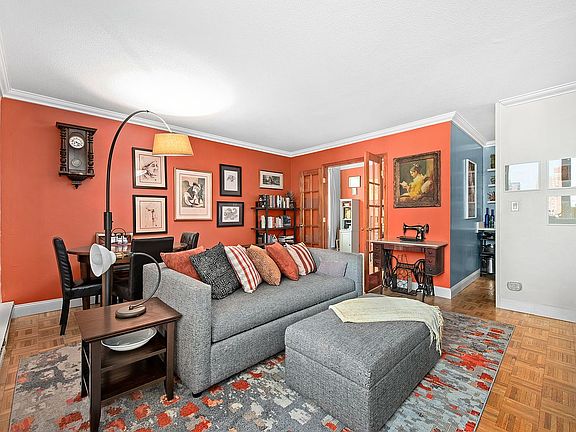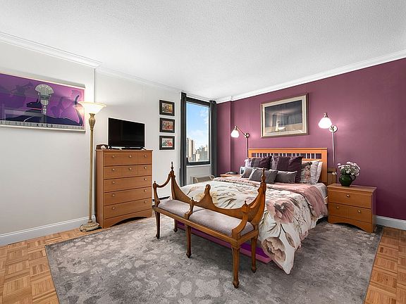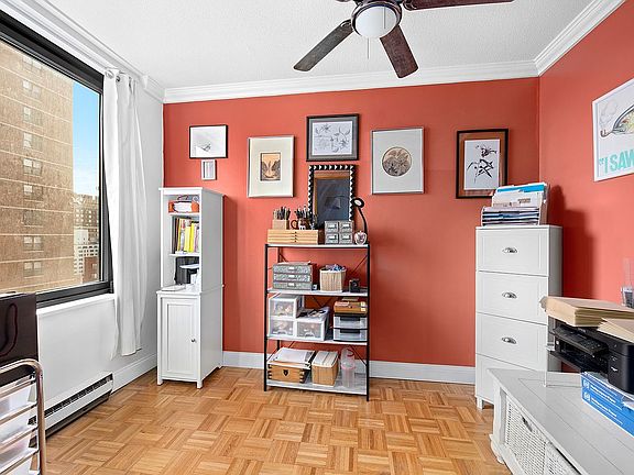 This unit comes with the extra details that make a home special; crown molding, French glass doors, tasteful upgrades and practical storage. Situated on a high floor, this apartment has an abundance of light and is pin drop quiet. The living area features breathtaking views of the city skyline and has plenty of room for a full living room furniture set as well as a dining table and chairs. French doors lead to a sun-drenched study or guest room with another large picture window. In the flow-through kitchen, upgrades include new quartz countertops and a new refrigerator. A new bathroom floor and counters complete the bathroom, and custom closets with new doors in the primary bedroom provide an entire wall of storage space. The bedroom can easily fit a king size bed plus nightstands and dressers, and the views from the window never disappoint. Common charges include electricity, gas, heat and water.