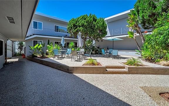 Great location, bright and airy, second floor unit facing court yard, 2 spacious bedrooms with oversize closets, large living room ,eating area off of kitchen, double panel, low E energy vinyl windows. One car space parking in an enclosed garage. Laundry facilities in the complex. Close to Lazy Acres super market, to the beach and freeway,