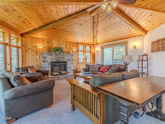 This lake house is full of surprises & is definitely not your typical raised ranch. With 2,628 s.f. of living space plus 1,095 s.f. of unfinished/garage area (2-3 bays) to shape into: a game room, home theater, workshop, or whatever...there's plenty of flexibility to do what you want. Set on a private .75 acre lot surrounded by community land, it offers lake views and the rare ability to walk to the lake, beach, and boat launch from your backyard without the hefty lakefront price tag. Features include 4 beds, 2 full & 2 half baths, formal dining room, grand living room & family rooms with stone fireplaces, multiple sitting areas, den/office, laundry room, new roof & 1-yr home warranty. There's PRIVACY, plenty of parking, and LOTS of potential. Located in Locust Lake Village, a STR-friendly, four-season community with 4 lakes, 3 beaches, fishing, boating, a private ski slope, tennis courts, a community garden, clubhouse, & more, all just minutes from all the major Pocono attractions.