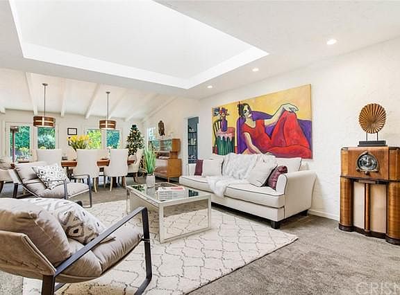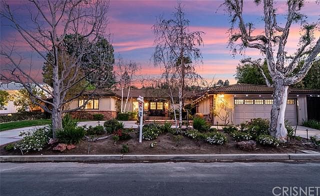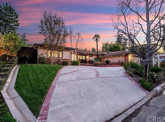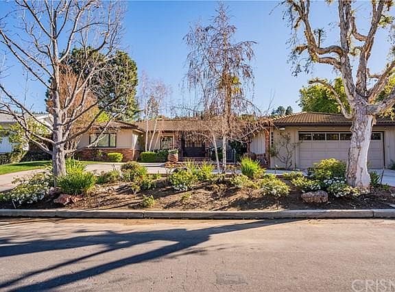 Lovely single level custom built traditional w/Spanish contemporary flair, over 3000 sq.ft on the best street in Royal Woods neighborhood of Sherman Oaks, South of Ventura Blvd. up in the hills. 12 minutes to UCLA, close to 405 & 101, EZ access to Westside & Valley. No freeway noise. Sitting proud above street w/ brick accented circular driveway, double door entry & framed by sky-high billowy bamboo, pine trees and lush landscaping & bubbling fountains set this house apart. New exterior paint. Formal foyer w/wood beam pitch ceiling entry, spacious designer guest bath, elegant lighting, textured walls throughout, recessed lighting, dramatic skylights in many rooms, oversized granite framed fireplace w/remote start up, updated kitchen, double door sub zero fridg, double oven, 5 burner range, built in micro, new white shaker cabinets w/soft close extra cabinets, drawers & storage, quartz counters,3 pantrys access to rear yard from breakfast area and oversized window looking out onto lush greenery. Formal dining room, family room, living room, AC, solar All bathrooms updated with quartz countertops, designer tile, tile floors, clear sapphire stall shower glass,new vanity & cabinets, primary has access to back yard, 3 bedrooms ensuite,4th bed converted to huge utility room w/ closet, washer/dryer more storage & giant pantry. Classic professors office w/ pitched ceiling, floor to ceiling shelves & custom corner desk unit, w/large window looking out to rear patio & big grassy yard. Catch the colorful afterglow of western sunsets in the backyard that features classic deep pool & spa, covered patio & 3 separate areas for seating and lounging, meyer lemon, roses, purple morning glorys, zen fountain, brick walkways & landing area, lovingly manicured for years, clean, spacious side yard for gardening projects or dog run. Solid, beautiful family home in best area of the valley. Neighborhood Dedicated Patrol.