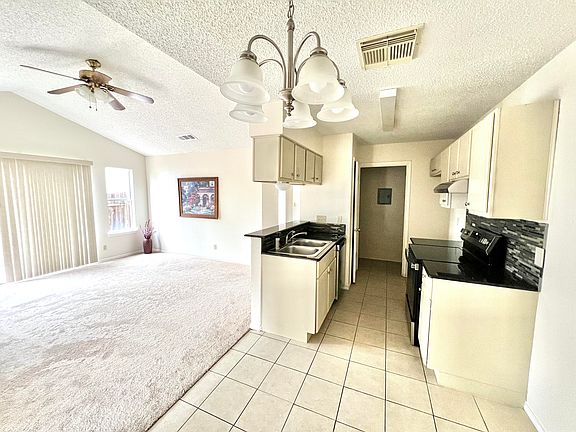 The vaulted ceiling makes for a spacious living area. New carpet in the bedrooms and living room. New bathroom light fixtures. New ceiling fans are in every bedroom.