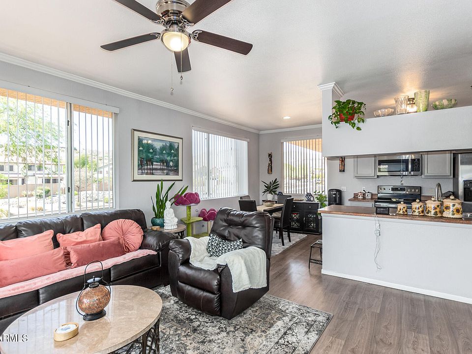 ULTRA RARE as this is the only FHA & VA approved condo community in Ahwatukee!! Nestled in San Simeon Condominiums, this charming Junior 2 bedroom has charm and mountain view GALORE!! Your welcomed by the inviting great room featuring wood-look flooring in all the right places, sliding glass doors to the balcony, crown molding, and large windows allowing natural light. The kitchen displays plenty of cabinet space, a convenient pantry, and stainless steel appliances. Comfy bedroom ensure a good night's sleep. Enjoy piece of mind with all NEW: HVAC, electrical panel & hotwater heater. Cozy balcony is perfect for leisure while sipping your favorite beverage. The Community provides assigned parking spot and access to amazing amenities such as a workout facility, clubhouse & swimming pool.