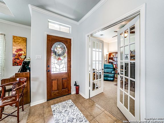 Located near UTSA, the Rim, La Cantera mall, Six Flags, and has easy access to major freeways and all San Antonio has to offer. Could be 5 Bedroom home as Study has Jack and Jill, plus upstairs Game has a Full Tub and Shower. See Attached Floorplan. Just to the left of the leaded glass entry is an office with french doors. There are three living areas, an upstairs game room with a full bath, ceiling fans and crown molding throughout, a large kitchen with black granite, an electric flat top with downdraft that can use gas, brand new appliances & garbage disposal, a reverse osmosis water softener, ring doorbell, alarm system, 2 water heaters, 2 A/C units. The master bedroom has a recessed ceiling and in the master bath you will find a jacuzzi tub and dual sinks. The den has a stone hearth fireplace with plenty of built-ins and overlooks the deck and large backyard. All full baths come with dual vanities. There is plenty of storage throughout. The neighborhood has a pool, tennis courts, sand volleyball and clubhouse. This is the perfect home for someone who enjoys hill country views and easy access to amenities and activities