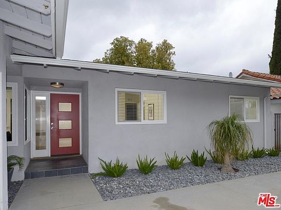 Located on a quiet cul-de-sac convenient to Cal State Northridge, this bright, clean, contemporary mid-century ranch home has been stylishly reimagined for modern family living. A spacious open floor plan includes a step down living room with vintage white quartz fireplace, dining room, reeded glass entry door and sidelight, and eat-in renovated kitchen with stainless appliances and Corian counters. The master suite features a double door entry, walk-in closet and ensuite bathroom with Roman soaking tub and contemporary finishes. Three additional bedrooms with hardwood floors, generous closets and an updated bath complete the interior. The front yard features drought resistant landscaping. There is a large grassy back yard with play area, covered patio, and additional entertaining area with decomposed granite and aggregate pavers.