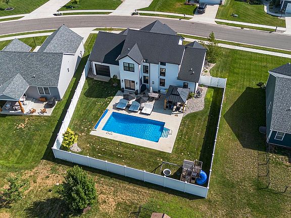 Welcome to modern luxury in Newbury Pointe! Built in 2019 by Place Builders and located in PHM Schools, this home blends style, function, and comfort in all the right ways. The open-concept great room stuns with a soaring gas fireplace flanked by two-story windows. The main level primary suite offers a private retreat with a beautiful board and batten wall, spa-like bath featuring a walk-in tile shower, separate soaking tub, dual sink vanity, and a spacious walk-in closet. You’ll love the bright kitchen with stainless steel appliances, a breakfast bar, and abundant cabinetry—perfectly positioned between a cozy breakfast nook and a formal dining area with custom built-ins that make entertaining easy. Step outside to your private backyard oasis featuring an inground pool, privacy fence, and space to relax or play (backyard furniture & equipment is negotiable for turnkey fun!). Home is equipped with interior and exterior SONOS audio system! Upstairs offers two additional bedrooms and a full bath with dual sinks. The finished lower level is a showstopper, with high-end finishes that match the main floor: shiplap walls, an electric fireplace, a rec room, sitting area, exercise space, full bath, and a versatile room with egress—ideal for a guest room or 4th bedroom. Additional highlights include main level laundry, a two-story foyer, and thoughtful design throughout that feels fresh and like-new. Turn the key and enjoy HGTV-level living—without the wait!