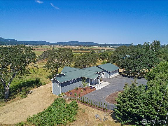 Breathtaking views across San Juan Valley to the Straits and majestic Olympic Mountains from this exquisite 2,256 sq. ft. home. Nestled on 7.87 acres of sun-drenched land, dotted with iconic Garry Oak trees, rugged rocky outcroppings and a 3 GPM well, this property blends natural beauty with modern convenience. Inside are soaring ceilings and walls of windows, flooding the great room with natural light. Spacious deck invites you to savor golden sunsets. Open-concept kitchen is a chef’s dream, featuring ample cabinetry, a central island, and dual dishwashers and ovens. This home boasts quality finishes, including bamboo flooring and Corian countertops. Paved driveway leads 1,258 sq. ft. attached three-car garage for your vehicles and gear.