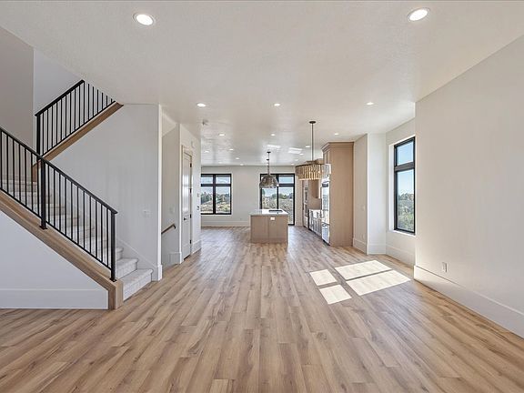 Welcome to this stunning luxury townhome that masterfully blends elegance and functionality all in one! Featuring an open-concept floor plan, this home boasts a spacious kitchen outfitted with custom cabinetry, a large center island with Quartzite countertops, designer pendant lighting, and high-end stainless steel appliances including a gas cooktop and double wall ovens. The rich wood tones and soft neutral finishes create a warm, timeless aesthetic. Enjoy indoor-outdoor perfect for entertaining. The main living area is adorned with wide-plank luxury flooring, custom lighting, and recessed ceiling fixtures to highlight the home's modern charm.
