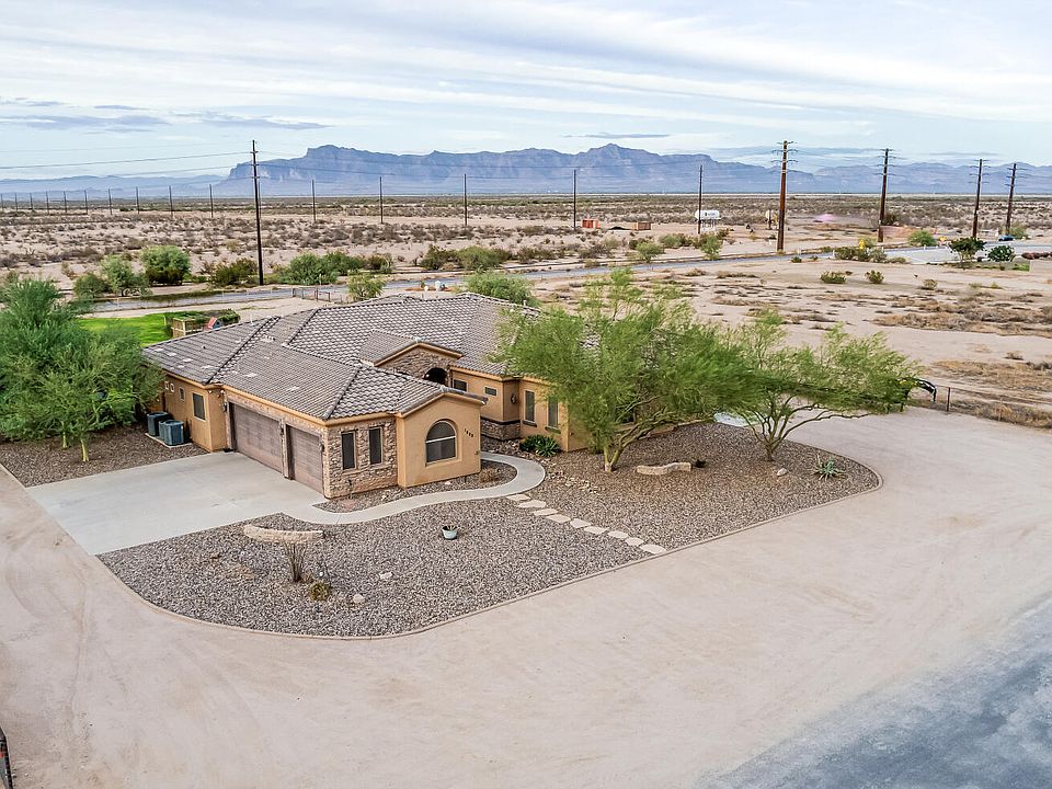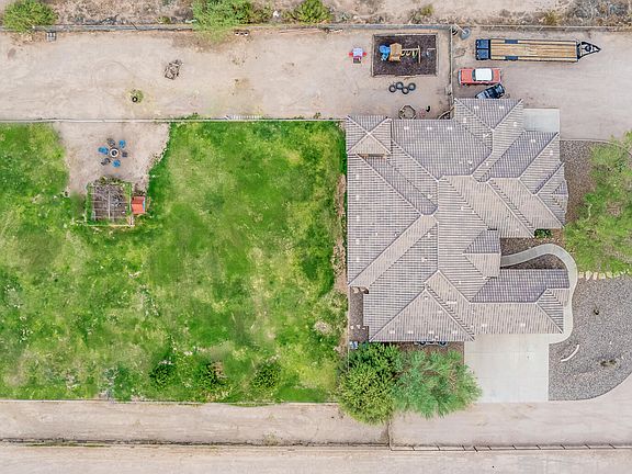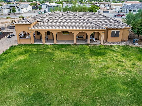 This stunning custom home with NO HOA sits on over 1.25 acres of irrigated horse property, surrounded by gorgeous mountain views! This ranch style estate features a gourmet kitchen with custom alder cabinetry, granite counters, walk-in pantry, breakfast bar, built-in refrigerator, and dual-fuel range with convection oven. The split master retreat offers a walk-in closet with additional laundry hook-up, jetted tub, travertine tile shower, dual sinks, and additional closet. The secondary bedrooms are accompanied by their own living room/playroom, creating flexible spaces. Enjoy movie nights or football parties in either the huge theater room or the bonus/game room (optional dining room).This home is packed with detail, offering coffered ceilings, 8-ft arched custom doors, 24 travertine flooring, upgraded fixtures, central vac system, soft water loop, tiled showers, built in speakers, wrap around covered patio, mature fruit trees, and chicken coop with established egg laying hens! . The 5th bedroom is located just off the master suite, and currently being used as a theater room, but would make a perfect setup for a nursery or home office;